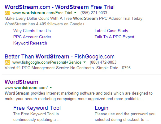 iSpionage offers a good example. If Wordstream, which ranks number one in both organic and paid search results, didn’t bid on its own brand terms, the search result for its competitor, FishGoogle, would appear at the top. FishGoogle uses the brand term “Wordstream” in the ad’s headline “Better Than Wordstream.”