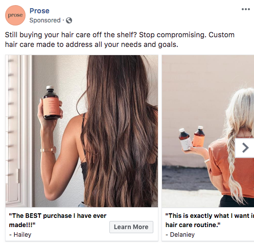 Prose’s Carousel ad illustrates the power of testimonials. In the post text, Prose empathizes with women’s frustration over off-the-shelf hair care products, offering a custom experience that will solve each woman’s hair “needs and goals.” The ad is comprised of carousel cards with different testimonials and images to support the ad’s claim of addressing hair needs. One of the customers in the testimonials raves “The BEST purchase I have ever made!!!”