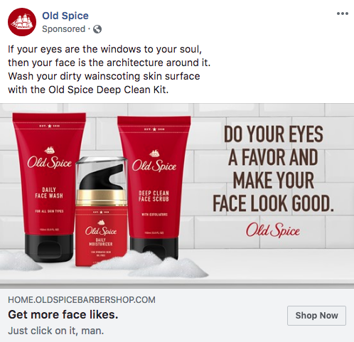 This Old Spice ad, as with most of the company’s marketing, uses humor to spice up users’ feeds. In the post text, Old Spice uses the adage “eyes are the windows to your soul” to convey the humorous idea that because the face is “the architecture around it,” it’s important to keep it clean. The text within the creative gives the humorous punch of “Do Your Eyes a Favor and Make Your Face Look Good” to urge the audience to use Old Spice to keep their faces well kempt. To top it off, the text below the image, “Get more face likes,” offers a silly yet simple value proposition. It tickles the viewer’s funny bone one last time with “Just click on it, man.”