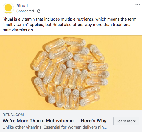 To capture the audience’s attention, Ritual creates intrigue around its product. “Ritual offers way more than traditional multivitamins do,” says the ad, suggesting that buyers will get health benefits that they can’t get elsewhere. The ad then increases interest. Using the teaser “We’re More Than a Multivitamin — Here’s Why,” Ritual compels the audience to learn more about the product. This ad gives enough information to communicate the main message (we offer more benefits than normal multivitamins) while also leaving the audience wanting to know more.