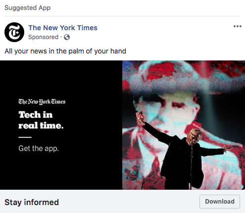 The New York Times markets its app in this simple yet powerful ad. The ad both evokes emotion and offers a value proposition. In very few words, the post text makes its audience feel empowered with “All your news in the palm of your hand.” The ad image offers the value proposition of “Tech in real time,” telling users they’ll get all their news instantly and conveniently from their mobile devices. The Times punctuates the message with “Stay informed” below the ad, directly next to the “Download” call to action.