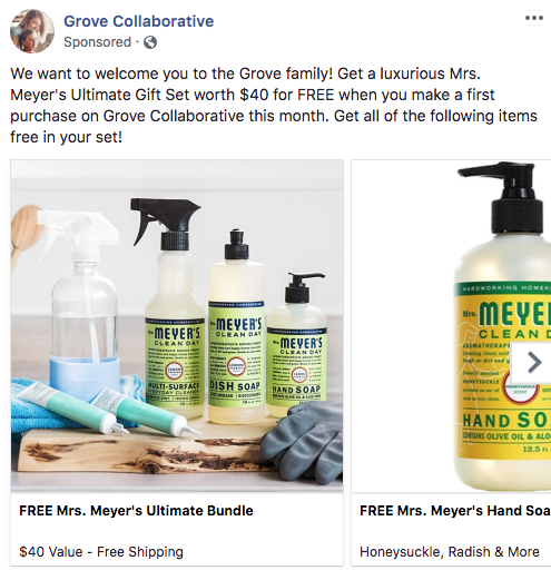 Grove Collaborative uses a Carousel ad to feature its products. The company also liberally uses the word “FREE” to entice shoppers. The images support the benefits described in the text by exhibiting the products buyers can get in their free set. Additionally, the images used in the ad are high-quality photos, making the company appear professional and trustworthy.