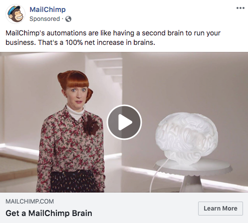 This MailChimp ad uses high-quality video, value proposition, and humor to drive its message. In the post text, MailChimp conveys the convenience of its marketing email automations by using the humorous comparison of a second brain. According to the ad, signing up for MailChimp is a “100% net increase in brains.” Translation? MailChimp automation is high-tech and intelligent.