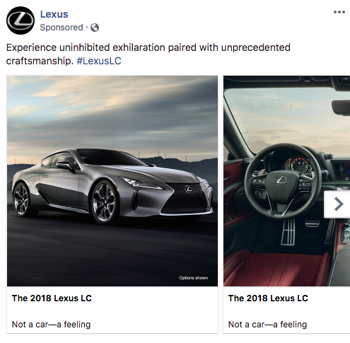 In this Carousel ad promoting the 2018 Lexus LC, the text creates a feeling of adventure and excitement by using the phrase “uninhibited exhilaration.” It then emphasizes that the Lexus LC is more than a product: “Not a car — a feeling.”