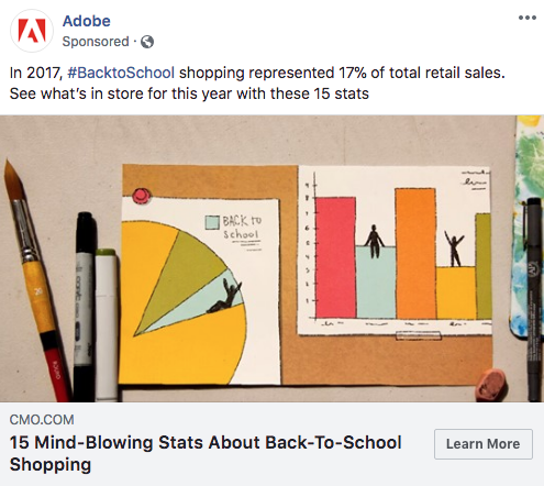 Adobe educates its audience in this back-to-school ad. Using some statistical information from last year’s back-to-school season in the post text, the ad invites the audience to access shopping data for 2018. By offering educational information, Adobe provides a benefit in exchange for customers’ clicks on the ad.