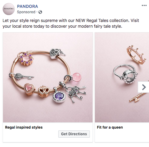 Each image features Pandora’s products against a light pink background, matching the background of the brand’s logo. In the last image of the ad, Pandora even presents a map with its location and invites the audience to “Get Directions,” driving foot traffic to physical stores.