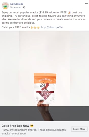 In the post text, Nature Box uses the word “free” to grab the audience’s attention. After all, who doesn’t like free products? The text also appeals to the audience’s sense of taste by using the words “great-tasting flavors” and “delicious.” To make the audience feel the need to try the product, Nature Box uses the words “unique, “can’t find anywhere else,” and “daring.” At the bottom of the ad, Nature Box also creates a sense of urgency by saying “Hurry,” “limited time offer,” and “run out soon!”