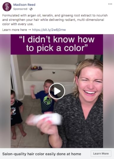 The ad also presents a value proposition by telling its audience the benefits they get when they buy from Madison Reed: beautiful, healthy, salon-quality hair and a coloring system easily done at home. The value proposition is also in the video: it features a woman getting ready to color her hair in her bathroom while her children watch from the background. The value is obvious: the hair color is easy and convenient to use. It appeals to women with hectic lifestyles, women who have limited time or money to spend two hours at a salon.