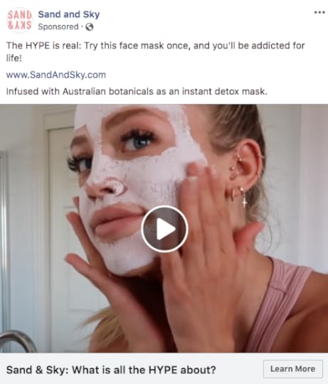 This Sand and Sky video ad both excites and informs its audience. In the post text, the words “hype,” “addicted for life,” and “instant” get the audience excited for the face mask. It also conveys that others have used the product. By creating excitement and buzz around the face masks, the ad entices its audience to watch the video to learn more.