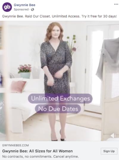 Gwynnie Bee uses value proposition as its primary tactic to promote its clothing subscription service. The vertical ad promotes unlimited exchanges, no due dates, all sizes, a 30-day trial, the ability to cancel anytime, and no contracts or commitments. The ad compliments these offers with a video of a model wearing the various style options the service offers.