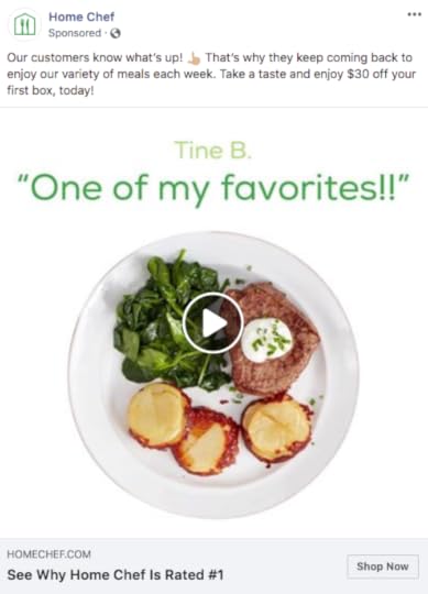 Home Chef highlights customer testimonials in this video ad to build trust and prove that the meal subscription service is rated number one. The post text also offers a discount on the first box, giving users more incentive to buy.