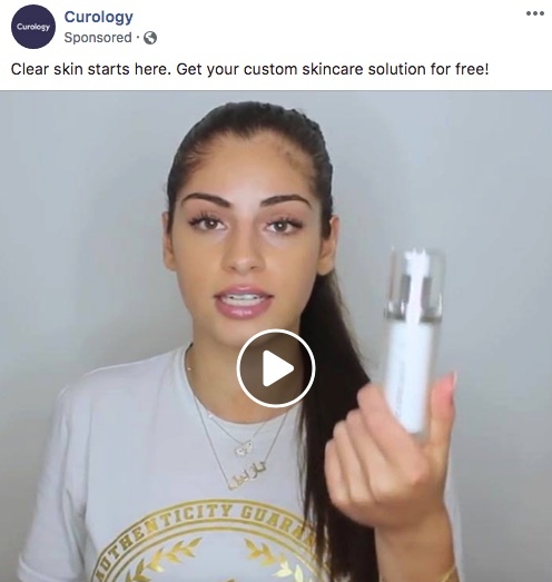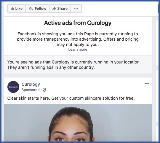 Navigating to Curology’s Info and Ads section, you can see the company primarily uses video ad formats to promote its skincare products. The videos typically offer testimonials or demonstrate the product in use. As a competitor, you might decide to make a video-focused campaign similar to that of Curology. You may also identify a shortcoming in Curology’s ads to give your campaign an edge up. For instance, Curology’s ads appear to primarily focus on women’s use of the product. You could make your campaign more inclusive of all genders.