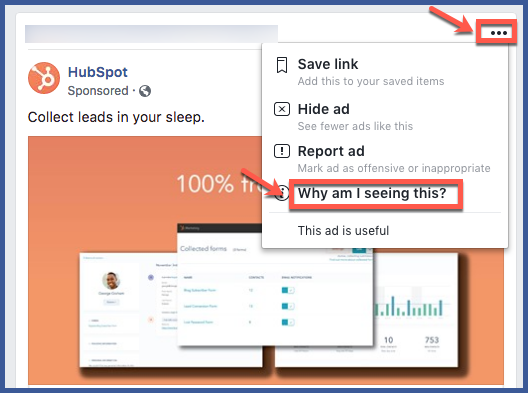 Facebook tries to make its platform as transparent as possible for users. Part of that effort includes providing information about business’s advertisements. When you see a competitor’s ad in News Feed, if you select the three dots at the top right corner of the ad, you will see the option that reads “Why am I seeing this?” Selecting that option allows you to see a brief summary of the advertiser’s target demographic. You can use this information to inform your own audience targeting.