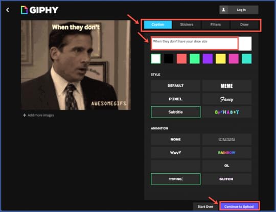 Step 3: Enter the caption you want to appear in your GIF, the color and style you want your caption text to have, and the animation (if any) you want your caption to have. You can also add stickers, filters, or drawings to your GIF, and reposition the caption by clicking on it and moving it. When you’re finished, select “Continue to Upload.”