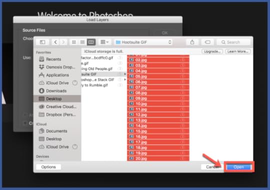 Step 2: Select the range of photos you want in your GIF. Use shift-click to select the whole list of files. Once they’re all selected, click “Open.”
