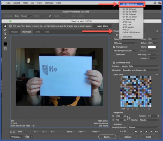 Step 10: You will be directed to an export menu box. Under “Preset,” select “GIF 128 Dithered.”