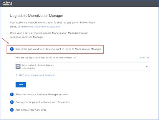Choose which apps and sites to move to Monetization Manager. You can also select “Can’t see your apps and sites?” if you are having trouble viewing the apps and sites for which you have an administrative role.
