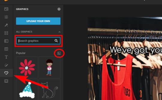 A call-to-action (CTA) button can make your image more attractive and attention-grabbing, and therefore amp your ad’s performance. Fortunately, you can easily add CTA buttons (and other graphics) to any image. Here’s how to do it: Go to the Graphics tab, type in your desired graphic (e.g., “shopping cart icon”) in the search bar, and then hit ENTER. You can also click on the square icon (circled in the image below) to search by category.