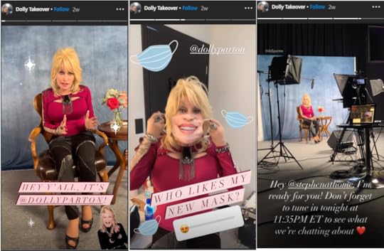 A Late Show promoted Parton’s guest appearance by letting her take over the show’s Instagram Stories for one day. Parton walked the show’s IG followers through her daily schedule, starting with her makeup routine and ending with an invitation to watch the show. Colbert is fond of IG Stories takeovers, and it’s been working out splendidly for both him and his guests.