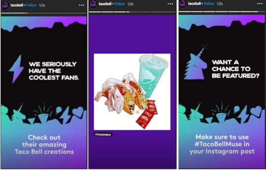 We saw something like this from Fast food chain, Taco Bell. The brand (@tacobell) is particularly good in featuring content created by its followers, which falls under their well-designed marketing plan. Every Monday, it posts fan art submitted using the hashtag #TacoBellMuse to its IG Stories. Aside from showing Instagram how much everyone just loves Taco Bell, the brand gives these up-and-coming artists exposure to more than 1.5 million people who follow the Instagram channel.
