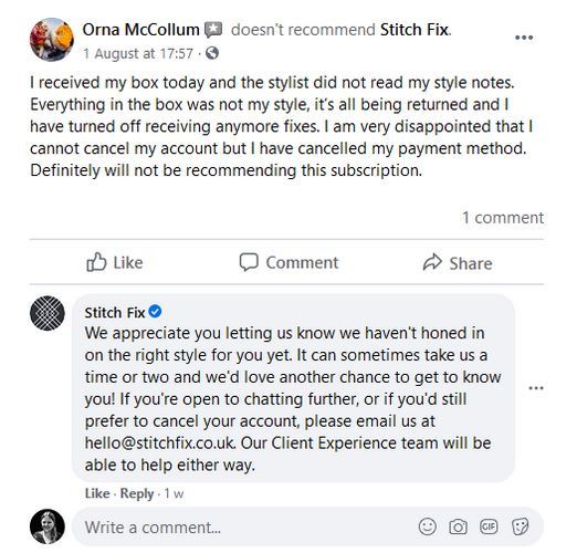 Stitch Fix is a clothing subscription delivery service that makes a point of responding to every review on social media, positive or negative. This customer was unhappy with the content of her delivery and felt that the stylist had not understood her requirements: