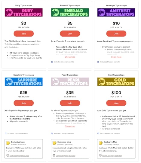 Create entertaining content and request funding from fans on Patreon. Many content creators use that platform, including people’s favorite YouTube guy group, The Try Guys. On Patreon you can also create membership subscriptions, offering exclusive content to fans.