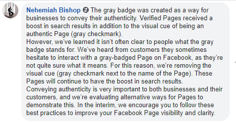“Based on feedback, we’re removing the gray badge and focusing on other ways for businesses to show their authenticity on Facebook,” said the Facebook spokesperson to Marketing Land.