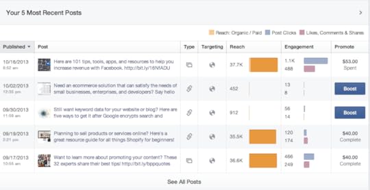 In this area, you can see how individual posts are performing. Some of these posts are ads, and you can differentiate between the ads and the organic posts by looking at the amount spent under “Promote.” Organic posts have the “boost” button underneath the “Promote” column.