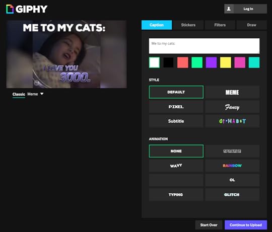 You can decorate your GIF with captions, filters, stickers, and drawings. Conveniently, the video already has a caption. However, for the sake of this tutorial, I wrote the words “Me to my cats” in big white font, providing context for the message “I love you 3,000.” The text you add must communicate the message you want to convey and compliment the animation you choose. You can drag your text anywhere on the GIF.