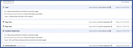 Step 15: If created by URL, the event is already triggered. For links or buttons, you should be able to click on it on the page you linked to your button event. Navigate back to the testing page in Events Manager. Your screen should look similar to the one below.