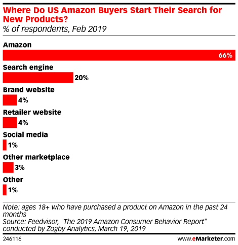 According to several surveys reported by marketing analyst Emarketer, a majority of US shoppers start with Amazon when searching for new products. In a March Feedvisor study, two-thirds of the US shoppers who were polled said they began their search for new products on Amazon, compared to one-fifth who started on Google. Respondents consisted of US shoppers who have made purchases on Amazon within the last two years.