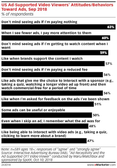 Hulu, as an example, had 40 percent more viewers on its ad-supported service year over year in 2018. Additionally, less than 40 percent of Hulu subscribers pay the extra four dollars for an ad-free experience, which means they don’t mind the ads. Emarketer forecasts Hulu’s ad revenues totaling more than $500 million by 2020.