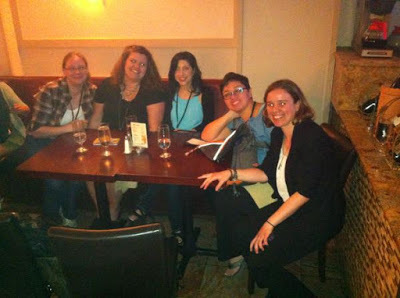 Ve and Chuck wail away.Afterwards, I had a blast hanging out with new friends Ve, Jason, and Deb. Ve and I had traded pitches earlier that day, and we had fun pitching each other's book to Jason and Deb based solely on what we could remember after several... hours of fun. Interesting hearing your book summed up from someone else, to see if your pitch gets the main idea across accurately.