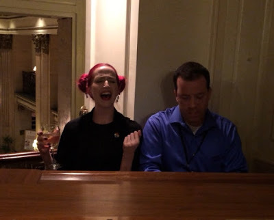 It looks like I'm wearing a Yamulke.The coktail reception that night was a BLAST. I talked to several agents I had pitched before the conference, and got some amazing advice from Paula. She warned me not to pitch my agents from the pitch slam right away (which was good, because at the point I was so PUMPED I was going to go email them from my hotel room that night.) If you pitch right away, she warned, it looks like you didn't learn anything at the conference, or weren't paying attention. It seems like you think you have nothing to fix or polish, which just seems cocky. Wait, fix, polish, and submit. The cocktail reception ended, and the night evolved. Chuck Sambuchino (editor of Writer's Digest) sits at the hotel piano and starts running through his IMPRESSIVE repertoire of party sing-alongs, in which I gleefully participated. Sweet Caroline is my karaoke jam.