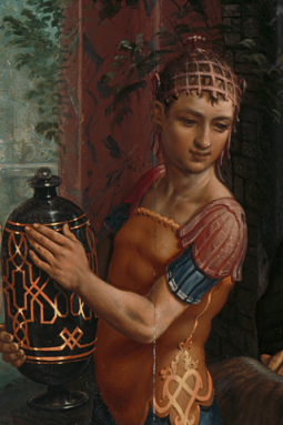 The figure Aertsen paints is very androgynous, which is not uncommon in Buddha statues, especially from Thailand. Aertsen says that this figure is “an attendant to the old King who’s greeting Jesus.” Interestingly, he’s the only person in the room who’s being looked at, besides the infant Jesus; the younger attendant to the old King is gazing at him. Doctor Science says that the three Magi can to be seem as representing Europe, Africa, and Asia, with the oldest of the three being Asia. This connects the “Buddha” as an Asian figure.