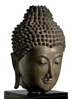 The “Buddha” is in vaguely military garb, with a breastplate and kilt, which is obviously very different from how a Buddha statue would portray the Buddha’s dress. This makes me wonder if Aertsen saw not a full-body statue, but merely a head, like the one shown above. Perhaps, thinking that the Buddha’s “do” was a helmet, he decided to portray the rest of the body in this “military-lite” fashion. The scanty armor of the “Buddha” would fit with him being more of a prince than a mere attendant, which is perhaps why he’s being looked at by the boy servant holding “Asia’s” robe.