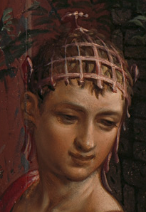 Doctor Science hypothesizes that Aertsen may have seen a Buddha statue, and made a quick sketch, not quite understanding what he was seeing with respect to the Buddha’s hair-style, which is portrayed in the painting by a kind of “helmet” made of straps, along with some kind of top-knot.. To shaw what he might have been trying to represent, here’s a 15th century Buddha head from Thailand, with the Buddha’s hair shown in tight curls, along with a top-knot. The resemblance is striking, and it’s easy to see how Aertsen might have thought this was a helmet.
