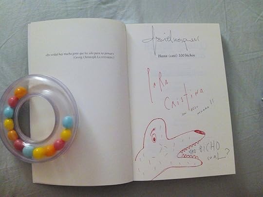 Ya hace unos meses que usted me firmó, en Barbastro, este ejemplar de Hasta (casi) 100 bichos y me dibujó un - - - ¿un perro? ¿un cocodrilo? - - - un bicho.