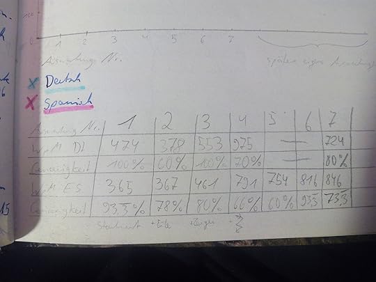 La tabla de la derecha son mis velocidades de lectura en cada evaluación: las de arriba para el alemán, las de abajo para el español. Los porcentajes miden la comprensión. Para cada texto había unas preguntas que responder. Se ve claramente: al subir de velocidad siquiera un poquito, enseguida doy respuestas erróneas. Un 80 % de comprensión parece mucho, pero en realidad, es poco. Los textos eran fáciles, y muchos versaban de temas que ya me conocía: el desarollo del cerebro infantil (evaluación 5), la historia de la vida en nuestro planeta (No. 6), especulaciones sobre el futuro de nuestra especie (ev. 7). También los textos alemanes eran fáciles. Leer dos páginas y responder mal a tres de entre diez preguntas - eso no es de recibo. No sirve.