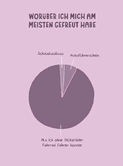 Bei Ihnen passt alles entweder in ein Torten- oder ein Balkendiagramm oder eine Kurve. Etwas mehr Abwechslung hätte ich mir gewünscht, oder Grafiken, die besser zum Inhalt passen. Das mit den Stützrädern zum Beispiel eher als Balkendiagramm. Und das mit dem Interesse für Statistik als Kurve oder Zeitstrahl.