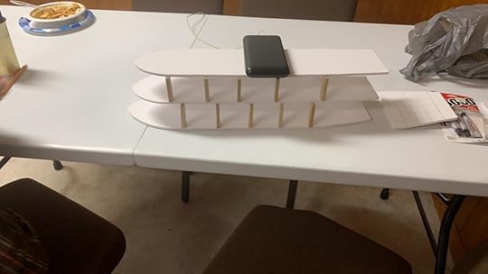 Our boat. I need to let the ribs dry before I can start working on the rest of the boat. Once the glue dries, I intend to shave the ribs down to shape the hull of the boat; however, I plan to make it so that it will break into segments so that the different levels will have easy access for play.