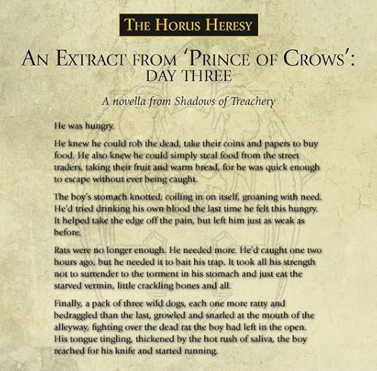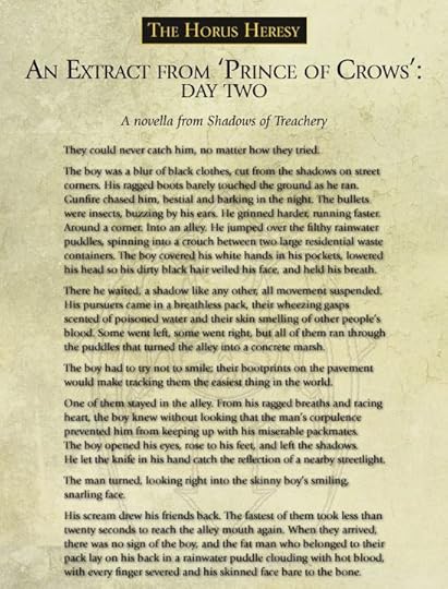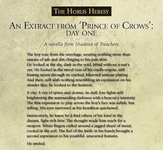 My contribution to this (which was supposed to be in The Primarchs) is Prince of Crows, which is a novella about (gasp!) Konrad Curze, Sevatar, and the Night Lords Legion after another run-in with the Dark Angels. It’s set just after ‘Savage Weapons’ and The Lion, and opens up with the VIII Legion devastated after the Dark Angels kicked their asses left and right across the Thramas Sector. The Legion lost the final battle, Curze is crippled after the Lion cut his throat, and the remaining Night Lord commanders are meeting up to decide just their options are. It also has a significant chunk of what I’d have sliced into a Night Lords novel, which is about Curze’s past and growth on Nostramo, and how he went from beggar child on the streets to their happy, happy king.