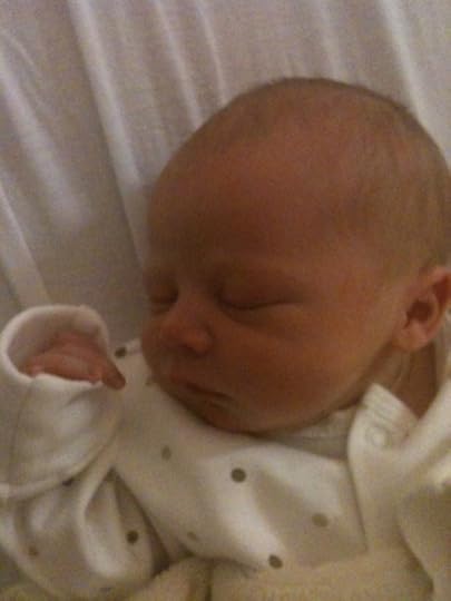 One and a bit weeks old, and half-asleep in my arms at 5am, while I try to finish the synopsis for Betrayer. Rogue Trader photocopies stuck to the wall behind.