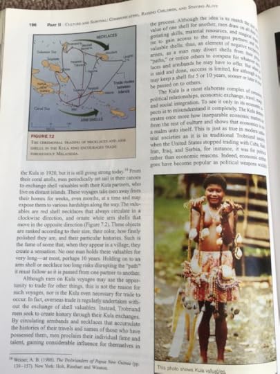 We studied some fascinating cultures from the Pacific Islands, including the people of the Trobriand Islands in Papua New Guinea, who formed a complex trading network and traveled long distances between islands in order to exchange for prestige luxuries, like shells (or maybe gold). The Trobriand Islands are a matrilineal society. Property ownership and family allegiances are traced through female relatives. Consequently, the most significant male figure in one's life is not one's father but one's mother's brother. I thought that was a very intersting shift from Western family structures, one that offered narrative possibilities. Several features of my island's culture and economy derive from the Trobriand Islands.