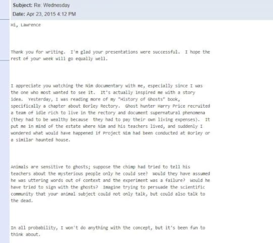 I read this information about Price and Borley Rectory the day after I had watched the documentary, and I thought, “What a cheapskate! The volunteers in Project Nim got to stay in their house for free.”