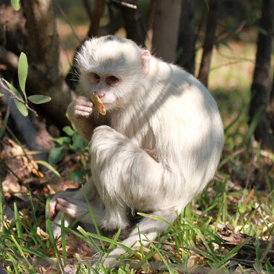 The hotel is situated on the banks of the Zambezi river. Electrified wire and sharp rocks had been placed between the hotel and the river, to prevent hippopotami from wandering into the hotel grounds and killing people. There was, however, a near-infinite amount of monkeys in the hotel, although they didn't appear to have started work on their Shakespeare scripts. Here's a photo that I took of one of them, which appears to be an albino: