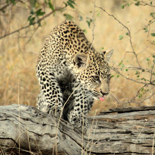 On this morning's game drive, the driver was called Moses. He led us through the wilderness, starting before dawn. We didn't see as many species as yesterday, but we did have the rare thrill of being in the midst of a huge buffalo herd, seeing a herd of elephants, and watching a leopard and her cub roaming around. The cub kept on launching surprise attacks at the mother, which she tolerated as only a mother can. Here's a picture that I took of the cub: