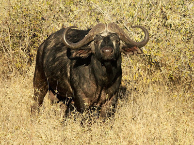 In the evening, we headed out on our first game drive. I've been on numerous game drives before, but this one was my best yet. We saw impala, steenbok (not the steenbok mentioned by Rashi in Chullin, which is an ibex, but rather a type of tiny antelope), nyala, buffalo, wildebeest, giraffe, vervet monkeys, baboons, civet, genet, warthog, hare, elephant, hornbills, vulture, zebra, leopard, and lion! Here are pictures that I took of buffalo, vulture, and lion: