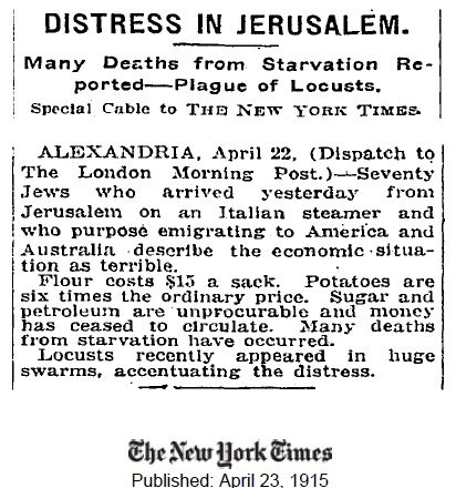 In the last few days, a devastating plague of locusts, numbering in the tens of millions, has been sweeping across Egypt. In Israel, the Ministry of Agriculture is on full alert. A special hotline has been set up, and the pesticides have been prepared. Hopefully, modern agricultural technology will help us avoid disasters such as that of 1915, when a plague of locusts in Israel led to much tragedy.