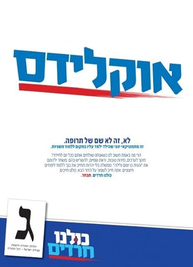 For those who can't make out the Hebrew words in the poster, the ad says "EUCLID - Not, it's not the name of a medicine. It's the Greek mathematics mathematician that (the Zionists want) your son to learn about instead of learning Mishnayos." It proceeds to detail how it is important for your children to learn good character, yiras Shamayim and Torah, rather than the foreign wisdom that the government wants them to study, etc.